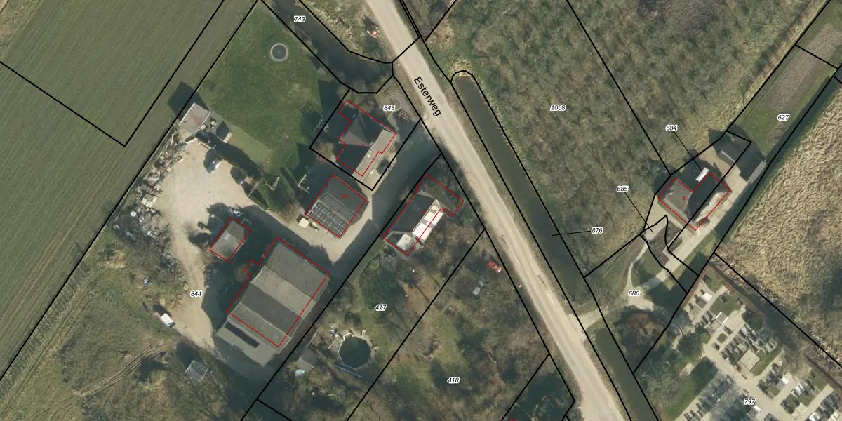 Esterweg 2 is gelegen op kadastraal perceel EST00E417. Deze kadastrale aanduiding is uniek en wordt gebruikt door het Kadaster om eigendomsrechten en andere zakelijke rechten vast te leggen. Het perceel maakt onderdeel uit van de kadastrale gemeente Est en Opijnen.