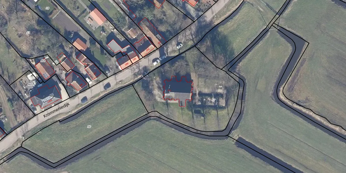 Krommeniedijk 182 is gelegen op kadastraal perceel KMN01C57. Deze kadastrale aanduiding is uniek en wordt gebruikt door het Kadaster om eigendomsrechten en andere zakelijke rechten vast te leggen. Het perceel maakt onderdeel uit van de kadastrale gemeente Krommenie.