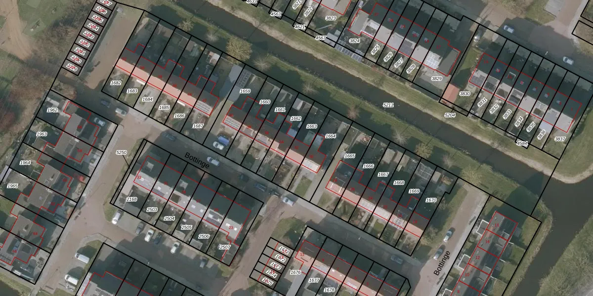 Het perceel waarop Bottinge 32 staat heeft een oppervlakte van 185 m². Dit is een middelgroot perceel. De perceeloppervlakte wordt geregistreerd door het Kadaster. Gedetailleerde informatie over de maten van dit perceel kunt u vinden in het rapport Kadastrale kaart met maatvoering van Bottinge 32.