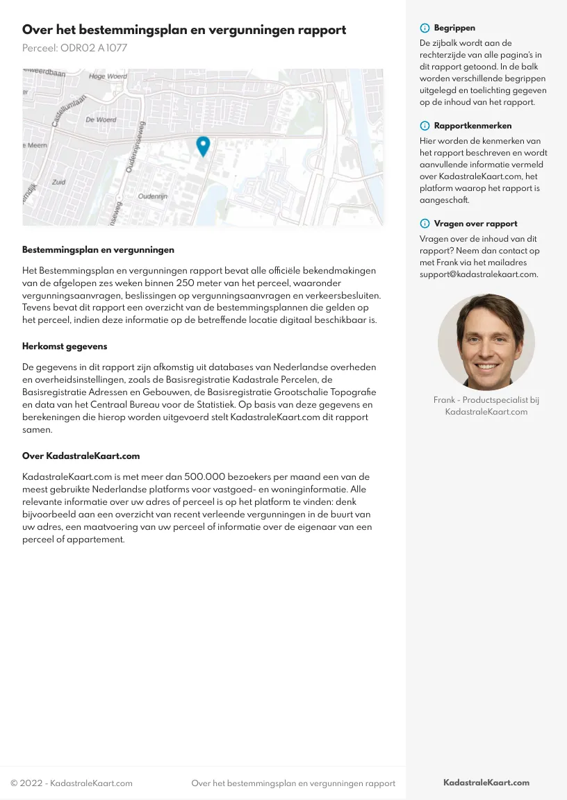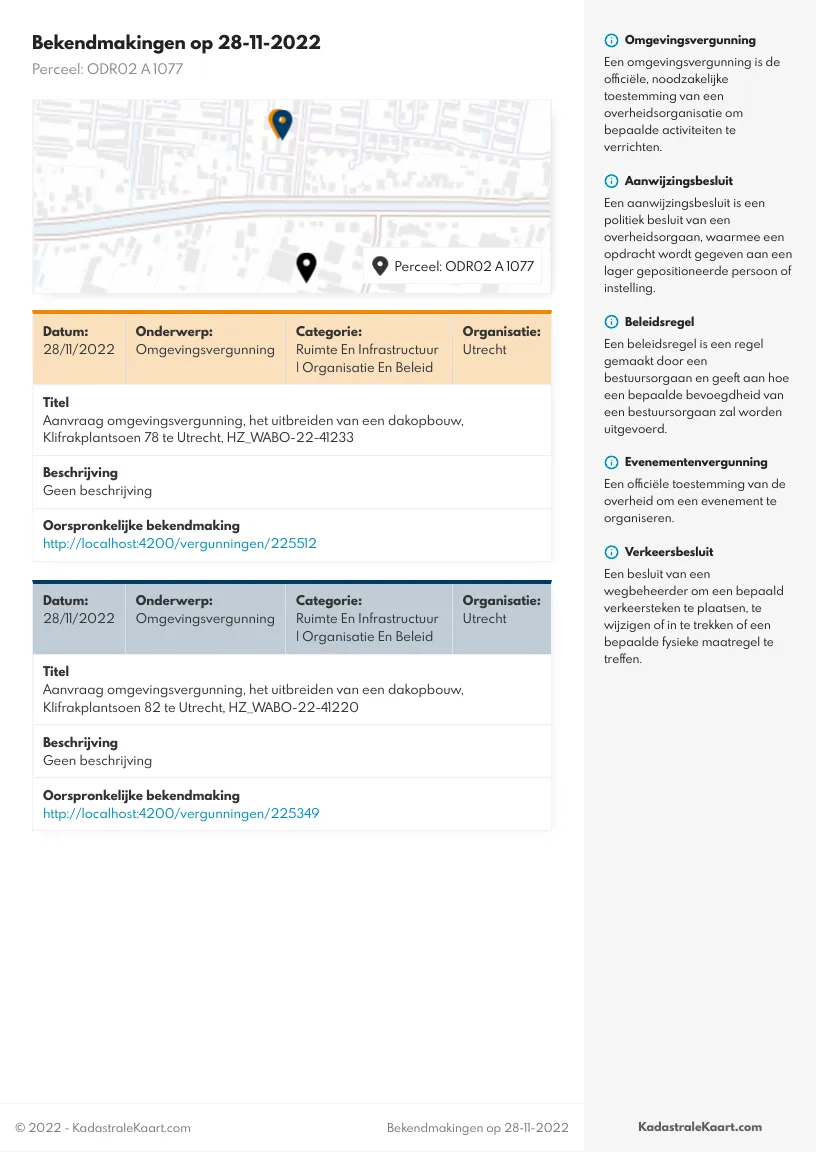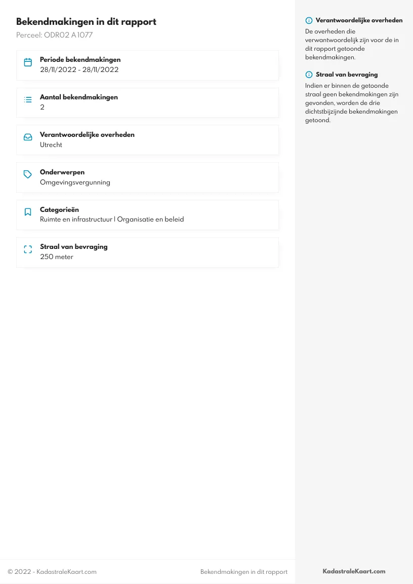 Het Bestemmingsplan en vergunningen rapport bevat alle officiële bekendmakingen van de afgelopen zes weken binnen 250 meter van het gekozen perceel, waaronder vergunningsaanvragen, beslissingen op vergunningsaanvragen en verkeersbesluiten. Voor elke bekendmaking binnen dit gebied ontvangt u: